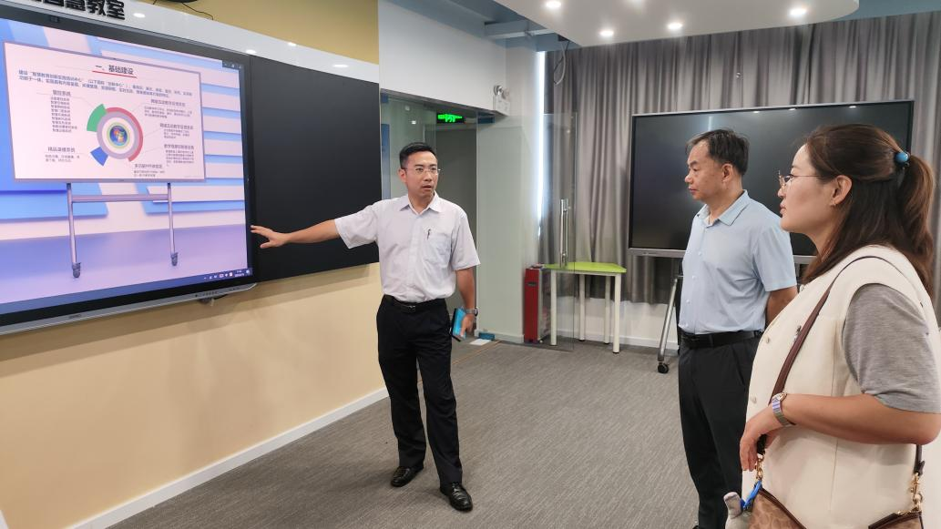 我校教师教育学院吴君胜副院长对姜永平主任一行表示欢迎,并带领来宾们参观了广州开放大学集培训、研究、实践、展示、实验于一体的智慧师训创新实践中心,详细介绍了学校承接的国家级智慧教育项目实施情况以及智能研训室、AI应用空间、AI+教师专业发展观测室等各个专业场室的功能特点和主要教育应用场景。