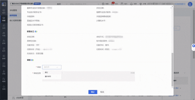 最后,请在弹出的页面中,仔细核对教师提交的修改信息,确认无误后点击通过并撰写审核意见,提交即可完成审核。