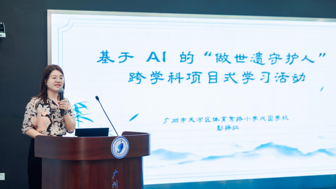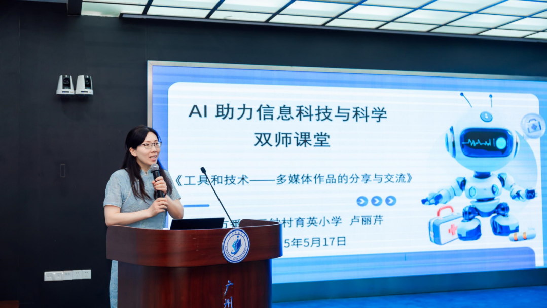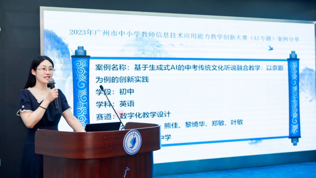 案例分享环节,来自广州市天河区体育东路小学兴国学校彭操红老师分享了《基于AI的“做世遗守护人”跨学科项目式学习活动》;广州市番禺区钟村育英小学卢丽芹老师分享了《AI助力信息科技与科学双师课堂》;广州市五中附属初级中学李昱坤老师分享了《基于生成式AI的中考传统文化听说融合教学——以京剧为例的创新实践》。
